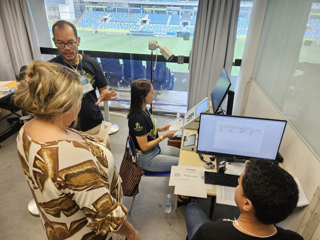 Eleitores e eleitoras que passaram pela seção 1153, localizada na Arena Pantanal, em Cuiabá, puderam liberar a urna eletrônica com a própria biometria para o