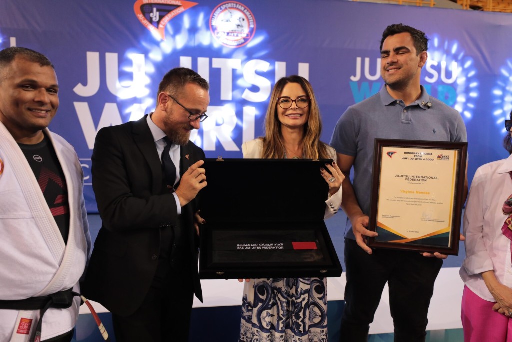A primeira-dama do Estado, Virginia Mendes, participou, neste domingo (27.10), do Campeonato Mundial de Jiu-Jitsu em Heraklion, na Grécia. Anteriormente reconhecida como Madrinha Nacional do