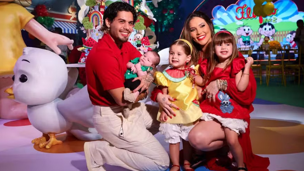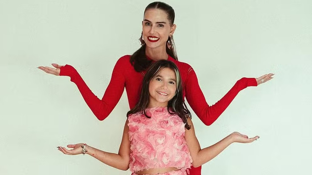 Deborah Secco, de 45 anos, exibiu o look para celebrar o Natal com a filha, Maria Flor, de 9 anos. “Eu e ela… passando para