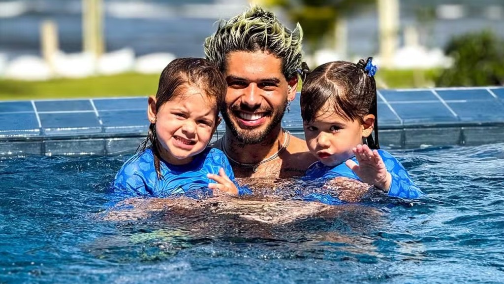 Zé Felipe curte dia de piscina com os filhos e declara: ‘Com eles me sinto mais completo’