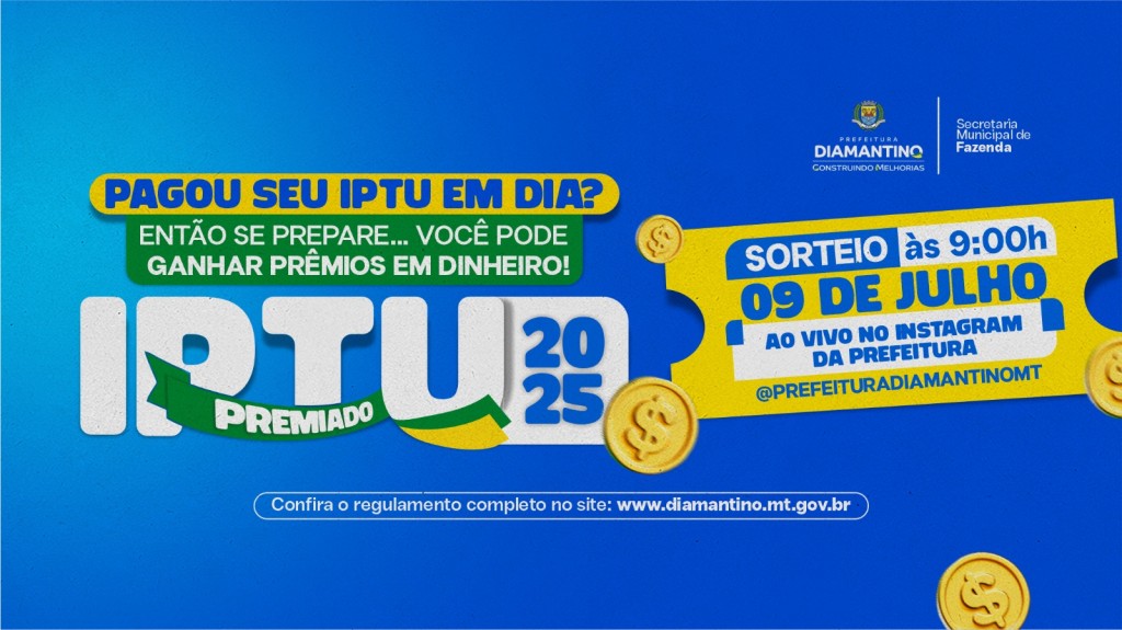 A Prefeitura de Diamantino inicia nesta quarta-feira (09.07) os sorteios da campanha IPTU Premiado 2025, regulamentada pelo Decreto nº 202/2025 e autorizada pela Lei Municipal