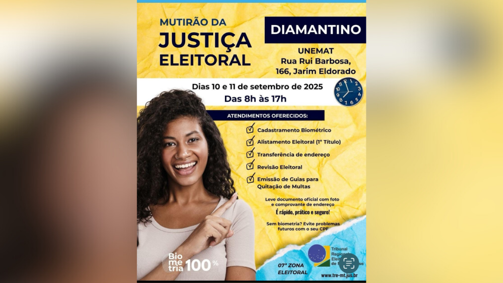 A Justiça Eleitoral, por meio do Tribunal Regional Eleitoral de Mato Grosso (TRE-MT) e da 7ª Zona Eleitoral, convida os eleitores de Diamantino, Alto Paraguai e Deciolândia para participar do “Mutirão da Justiça Eleitoral – Biometria 100%”, que será realizado nos dias 10 e 11 de setembro, das 8h às 17h, na Universidade do Estado de Mato Grosso (UNEMAT), em Diamantino.