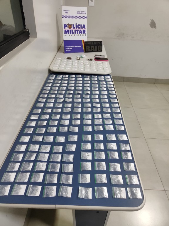 Os policiais do Raio entraram na residência e realizaram buscas, localizando mais 213 porções de cocaína e três porções de maconha, em cima de um sofá. Além disso, os militares também encontraram uma balança de precisão e demais materiais utilizados para o tráfico de drogas.