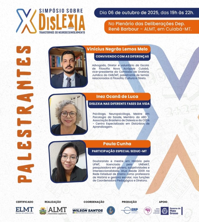 A Assembleia Legislativa de Mato Grosso (ALMT) promove, no dia 6 de outubro, o 10º Simpósio sobre Dislexia – Transtornos do Neurodesenvolvimento. O evento é realizado pelo deputado Wilson Santos (PSD) e ocorrerá no Plenário das Deliberações Renê Barbour, às 19h30.