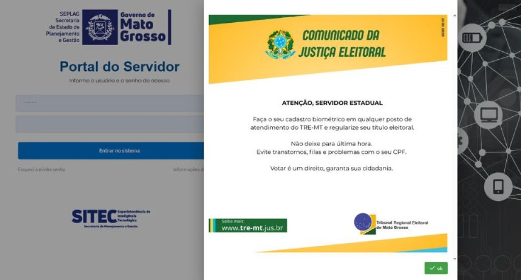 Dando continuidade às ações conjuntas para ampliar o cadastramento biométrico dos servidores públicos estaduais, o Tribunal Regional Eleitoral de Mato Grosso (TRE-MT) e a Secretaria de Planejamento e Gestão (Seplag-MT) passam a divulgar, a partir desta quinta-feira (23.10), uma mensagem institucional no Portal do Servidor — plataforma que concentra diversos serviços e informações voltadas ao funcionalismo público estadual.