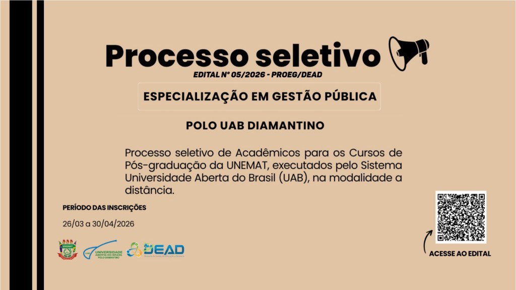 A Universidade do Estado de Mato Grosso (UNEMAT), por meio da Universidade Aberta do Brasil (UAB) Polo de Diamantino, está com inscrições abertas para o