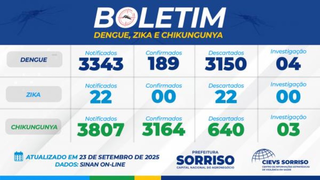 Hoje os bairros com maior número de registros de chikungunya estão o Vila Bela com 254; São José com 159; Nova Aliança I com 145 registros; Jardim Amazônia com 140 e Novos Campos com 131 situações positivas. O antigo distrito de Boa Esperança e atual município vizinho de Boa Esperança contabilizou 367 registros – vale lembrar que no Ministério da Saúde, Boa Esperança ainda consta veiculado à Sorriso. Já em relação à dengue são 13 casos no Rota e 12 no Jardim Amazônia.