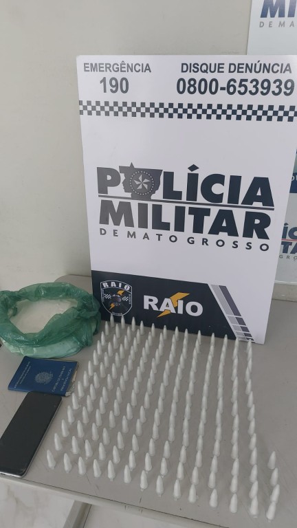 A Polícia Militar, por meio da Companhia de Rondas e Ações Intensivas Ostensivas (Raio), prendeu um homem, de 32 anos, por tráfico ilícito de drogas, nesta quinta-feira (05.12), em Cuiabá. Com o suspeito foram apreendidas 173 pinos de cocaína e um saco com ácido bórico, usado na produção da droga.