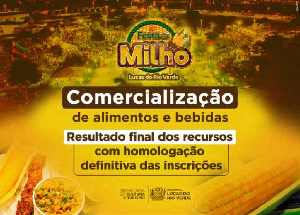 A Secretaria de Cultura e Turismo de Lucas do Rio Verde divulgou, nesta terça-feira (15), o resultado final das inscrições do Edital de Seleção nº 001/2025, voltado à comercialização de alimentos e bebidas na Praça de Alimentação da 4ª Edição da Festa do Milho.
