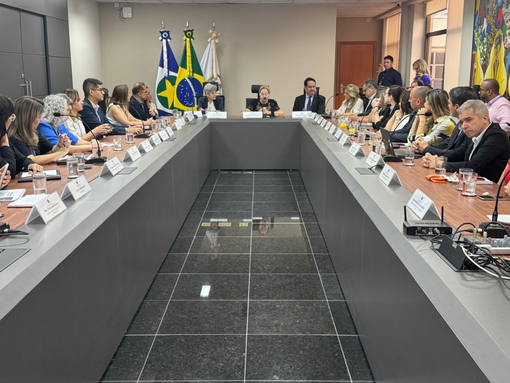 #Paratodosverem. Esta matéria possui recursos de texto alternativo para promover a inclusão de pessoas com deficiência visual. Descrição da imagem: Foto colorida que mostra a mesa em formato de U da sala de reuniões da Presidência do TJMT lotada. Na cabeceira, está a presidente ladeada dos juízes auxiliares. Atrás deles, há um mastro com as bandeiras do Brasil, de Mato grosso e do Poder Judiciário estadual.