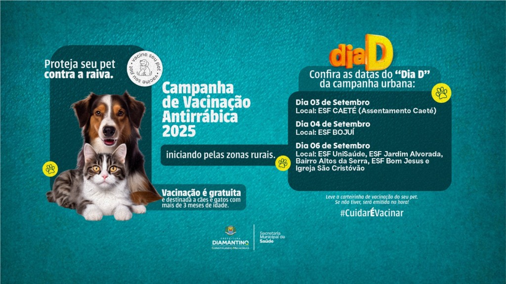 A Prefeitura de Diamantino, por meio da Secretaria Municipal de Saúde, realiza neste sábado, 06 de setembro, o Dia D da Campanha de Vacinação Antirrábica 2025 no Novo Diamantino. A mobilização acontecerá das 08h às 16h e tem como objetivo ampliar a cobertura vacinal de cães e gatos do município.