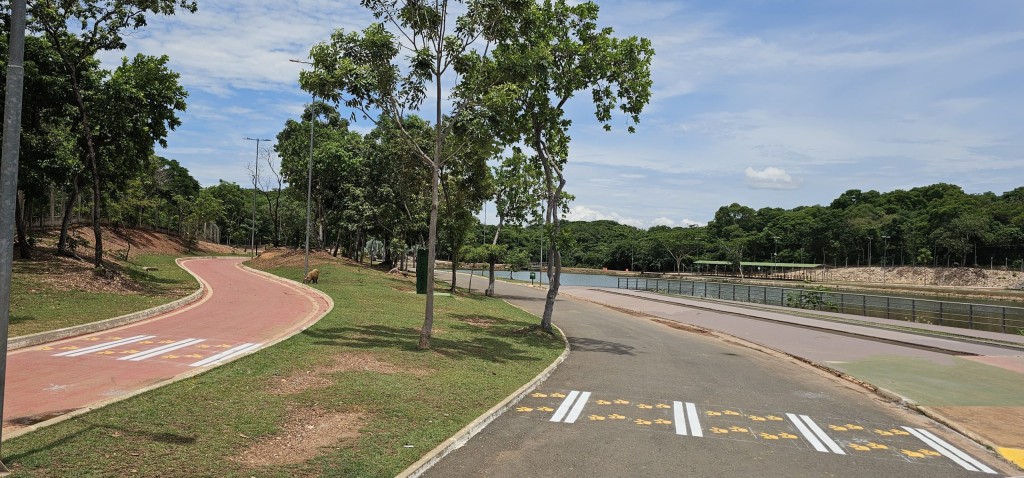 A imagem mostra a pista de caminhada, ciclovia, e o lado do Parque das Águas. O céu está azul e há árvores no enquadramento.