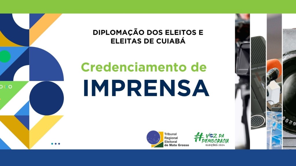 #DescriçãodaImagem: A arte de divulgação possui fundo branco com a mensagem “Credenciamento de Imprensa” ao centro. Acima, a frase: “Diplomação dos Eleitos e Eleitas de Cuiabá”. Abaixo, estão as logomarcas das Eleições Municipais 2024 e do TRE-MT. No lado direito, cortes de imagens com equipamentos de imprensa; à esquerda, quadriculados coloridos.