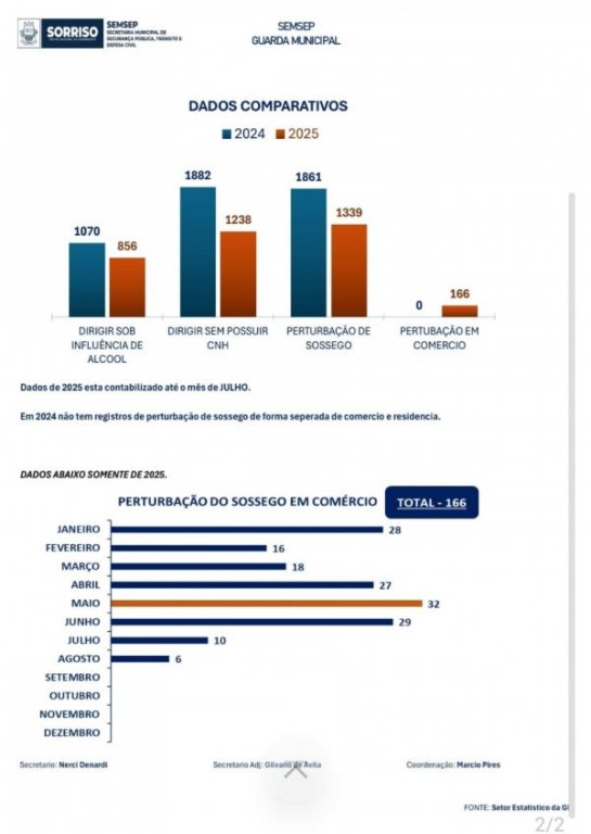 Os registros de atendimentos de situações de perturbação do sossego alheio também diminuíram. De janeiro a julho foram 1.505 chamados atendidos, 166 dessas situações exclusivamente ligadas à perturbação do sossego em comércios. Em 2024 foram 1.861 situações. “Esse número – 1.861, engloba todas as chamadas de 2024, não há a separação de comércios e residências”, explica Pires. “E vale ressaltar que a GMT está sempre à disposição da população”, acrescenta.