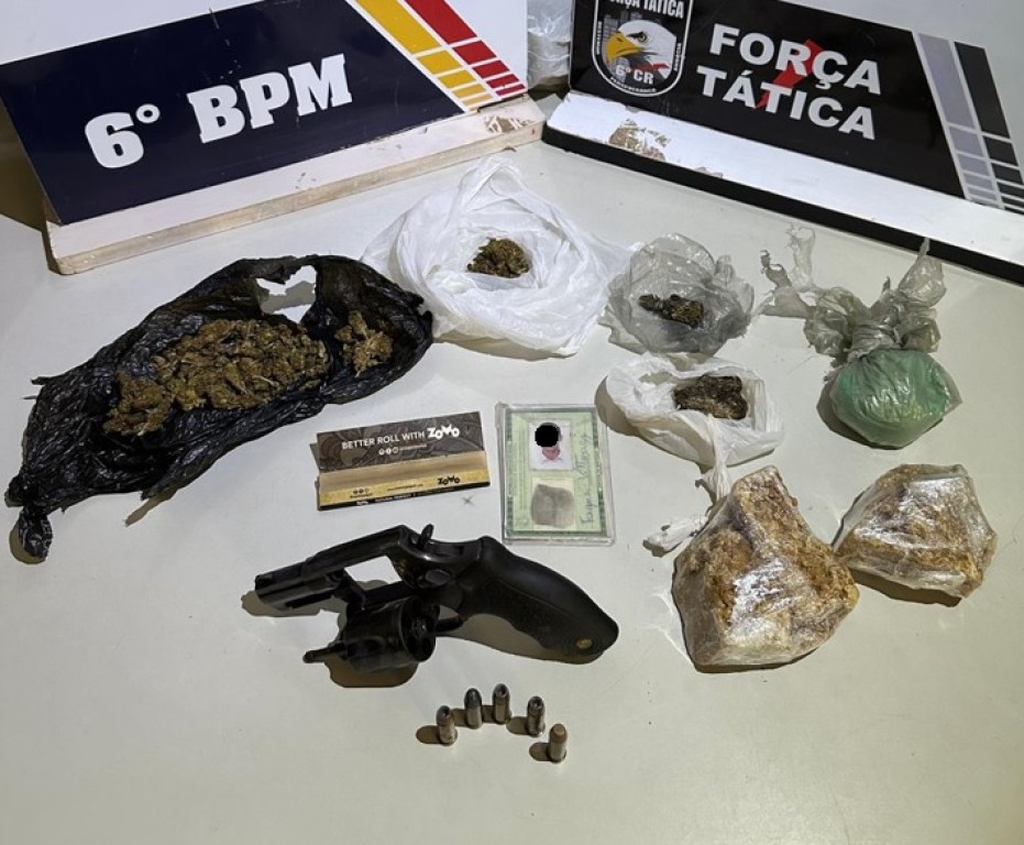 Além disso, os policiais ainda localizaram em cima do guarda-roupa um revólver calibre .38 municiado com cinco munições ainda intactas. Diante do flagrante, o homem e todo material recolhido foram encaminhados à delegacia.