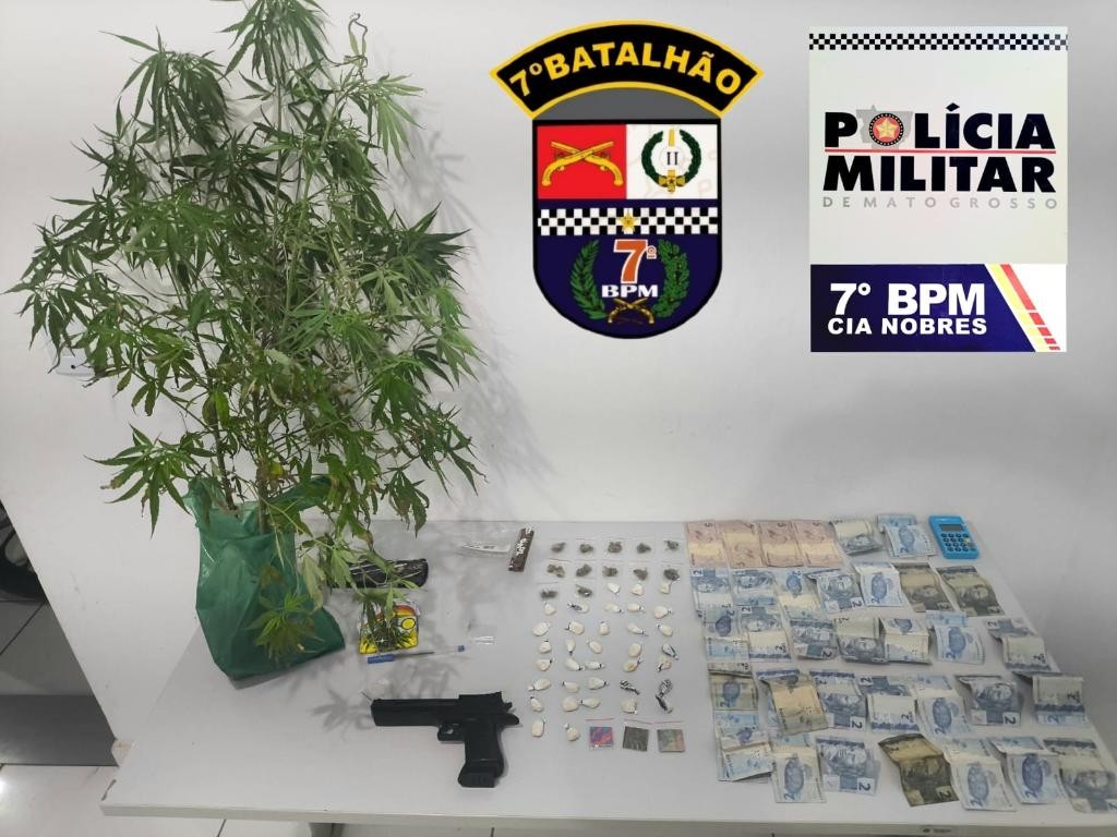 Policiais militares de Nobres prenderam um homem, de 21 anos, por tráfico ilícito de drogas, nesta segunda-feira (23.3). Na ação, a PM apreendeu pés de maconha e porções da mesma droga, porções de pasta base de cocaína e LSD. Um simulacro de arma de fogo também foi localizado e apreendido.