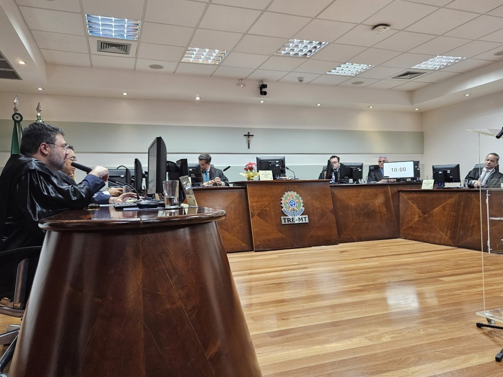 #PraTodosVerem: Foto que mostra o Plenário do TRE-MT, com o brasão do Tribunal gravado no centro, e, à esquerda, aparece o juiz-membro Pérsio Oliveira Landim, que fala ao microfone, na sessão de despedida. Os demais membros do Pleno aparecem ao fundo. Ao final da matéria, tem uma galeria com mais fotos da sessão plenária.