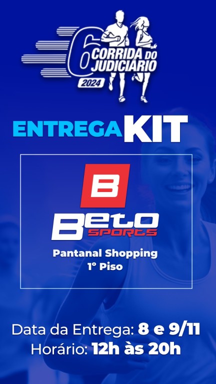 A entrega dos Kits da 6ª Corrida do Judiciário 2024 será realizada nos dias 8 e 9 de novembro, das 12h às 20h, na loja Beto Sports, 1º piso do shopping Pantanal. Cada kit é composto por uma camiseta, confeccionada pela marca cuiabana Onng, um chip e o número de peito. A 6ª Corrida do Judiciário será realizada no dia 10 de novembro, em Cuiabá. O evento, do Tribunal de Justiça de Mato Grosso (TJMT), será realizado no dia 10 de novembro, em Cuiabá.Neste ano, o percurso será de 6 km para a corrida e de 3 km para a caminhada.