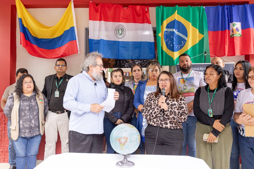 A imagem principal mostra a secretária de Assistência Social, ao lado de um grupo de servidores e membros da pastoral do migrante. Ao fundo as bandeiras do Brasil e outras várias nacionalidades como venezuela, Colômbia e Haiti.