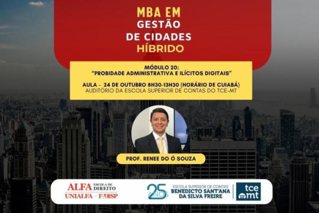 O MBA em Gestão de Cidades do Tribunal de Contas de Mato Grosso (TCE-MT) chega ao seu 20º módulo nesta sexta-feira (24), com o tema “Probidade Administrativa e Ilícitos Digitais”. A aula será ministrada pelo professor e promotor de Justiça Renee do Ó Souza, a partir das 8h30, no auditório da Escola Superior de Contas, com transmissão ao vivo pelo Canal do TCE-MT no YouTube e pela TV Contas (Canal 30.2).