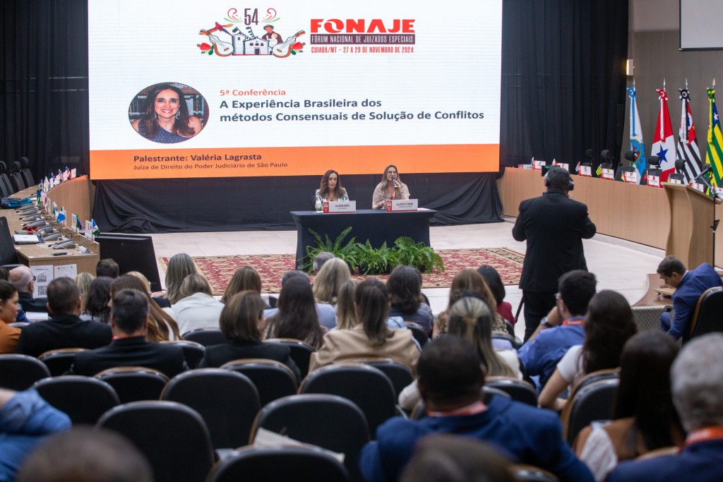 A ‘Experiência Brasileira dos Métodos Consensuais de Soluções de Conflitos’ foi tema da 5° Conferência no segundo dia de programação da 54ª edição do Fórum Nacional de Juizados Especiais (Fonaje), na tarde dessa quinta-feira (28 de novembro), no Plenário 1, ‘desembargador Wandyr Clait Duarte’, do Tribunal de Justiça de Justiça de Mato Grosso (TJMT).