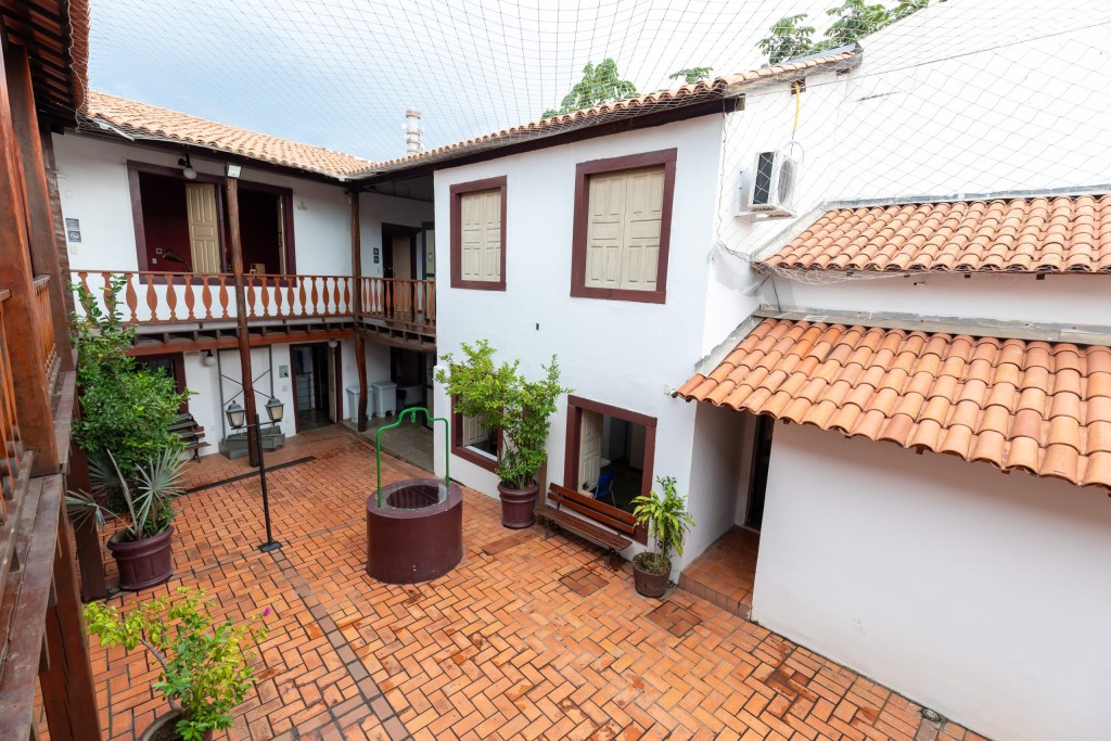 A foto mostra o pátio interno do casarão que abriga o Museu de Imagem e Som de Cuiabá. Ao centro do espaço está localizado um dos 23 poços que ainda estão em funcionamento no Centro Histórico da cidade. A estrutura física do prédio exibe construção antiga e bem conservada, sendo de dois andares com varanda para apreciar o espaço.