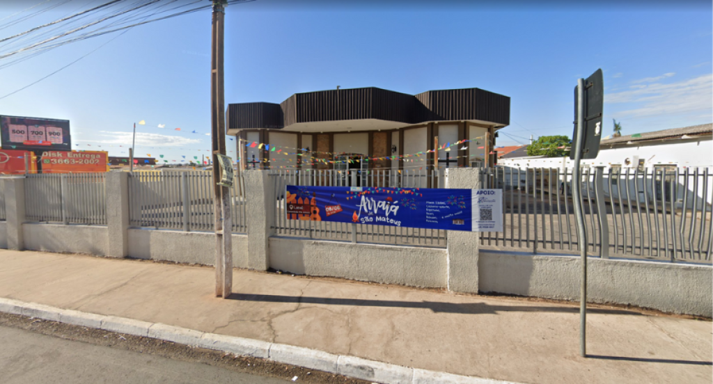 #PraTodosVerem: A imagem mostra a fachada da Paróquia São Mateus, um prédio de formato octogonal, cercado por um muro baixo com grades de ferro. Na frente, há uma faixa colorida presa ao portão, anunciando a festa junina da paróquia. O local está em uma rua asfaltada, com calçada larga, e ao fundo é possível ver outros estabelecimentos comerciais e placas de publicidade.
