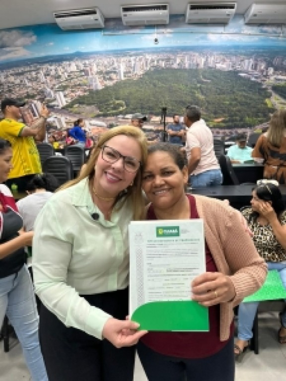 A presidente da Câmara Municipal de Cuiabá, vereadora Paula Calil (PL), participou da solenidade de entrega de títulos de propriedade promovida pela Prefeitura da Capital, neste sábado (4), no plenário do Legislativo. Na ocasião, a parlamentar parabenizou os moradores contemplados e destacou a relevância da regularização fundiária para o desenvolvimento da cidade.