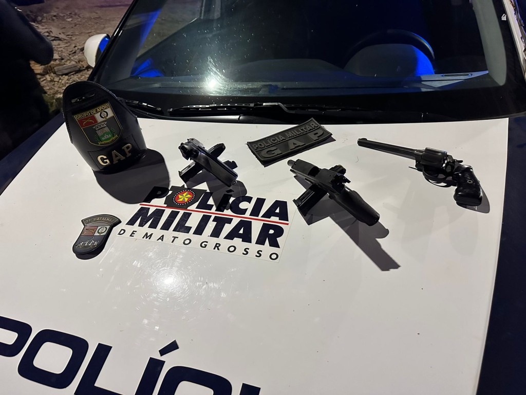 Os policiais militares apreenderam duas pistolas e um revólver, além de diversas munições e duas motocicletas utilizadas pelos suspeitos para invadirem a casa, sendo uma modelo Honda Twister e outra Honda CG 150 Fan.