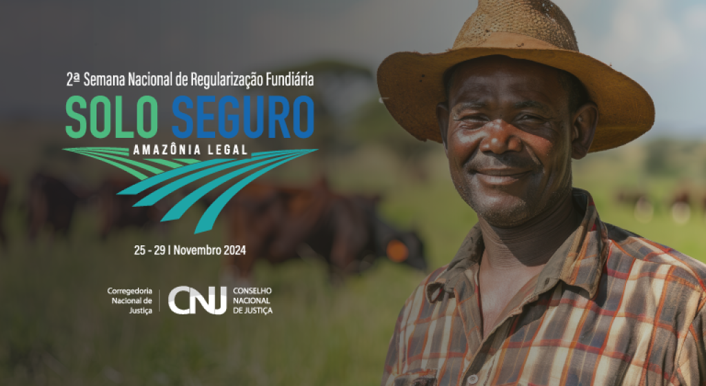 #ParaTodosVerem: esta matéria possui recursos de texto alternativo para promover a inclusão de pessoas com deficiência visual. Foto 1: peça publicitária mostrando um homem negro com chapéu de palha e camisa xadrez, tendo ao fundo uma fazenda com bois desfocados. No canto direito, está a logo da 2ª edição da Semana Nacional de Regularização Fundiária Solo Seguro – Amazônia Legal, com a data 25-29 de novembro de 2024.