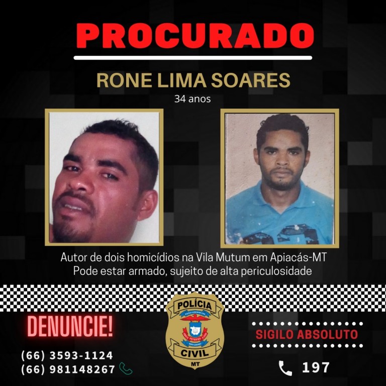 Conforme a investigação, Rone Lima Soares, de 33 anos, executou duas vítimas, por motivo fútil e recurso que dificultou a defesa, no garimpo Vila Mutum, na zona rural de Apiacás. Após matar as vítimas, ele fugiu, armado, para uma região de mata.