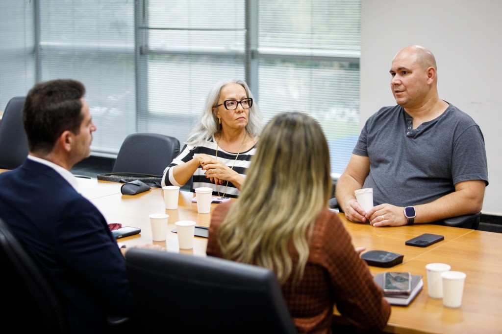 A imagem mostra o prefeito de Cuiabá juntamente com a secretária de Saúde e o promotor Milton durante uma reunião que discute estratégias para a saúde do município. Todos estão sentados ao redor de uma mesa de reunião.