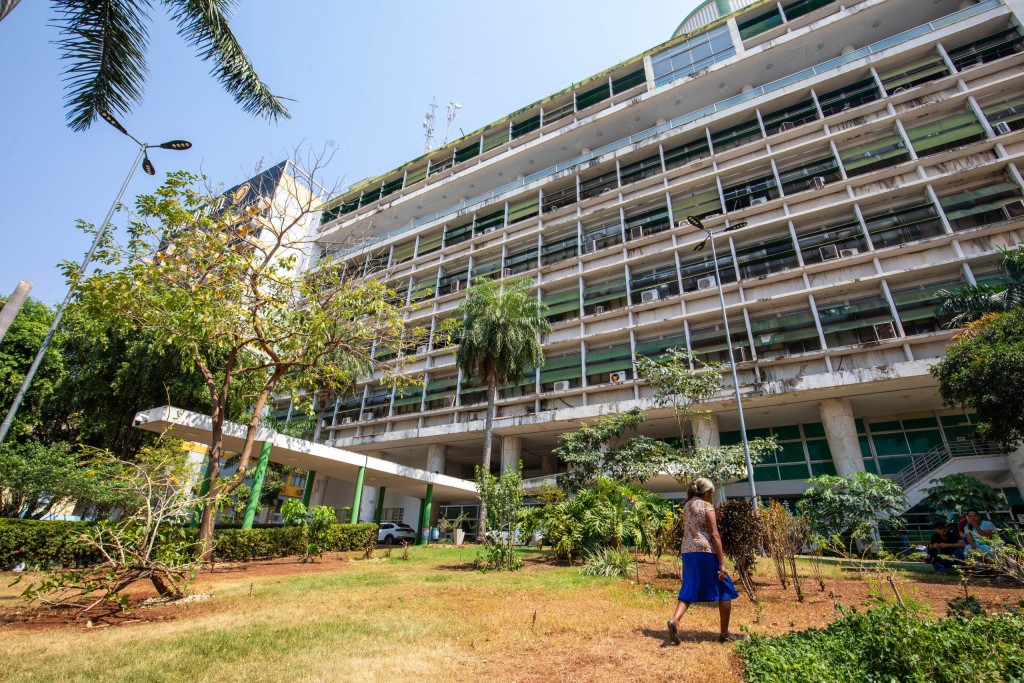 A foto mostra o prédio da Prefeitura de Cuiabá, denominado Palácio Alencastro, com fachada predominante nas cores verde e branca. Em frente ao prédio, há destaque para um gramado.