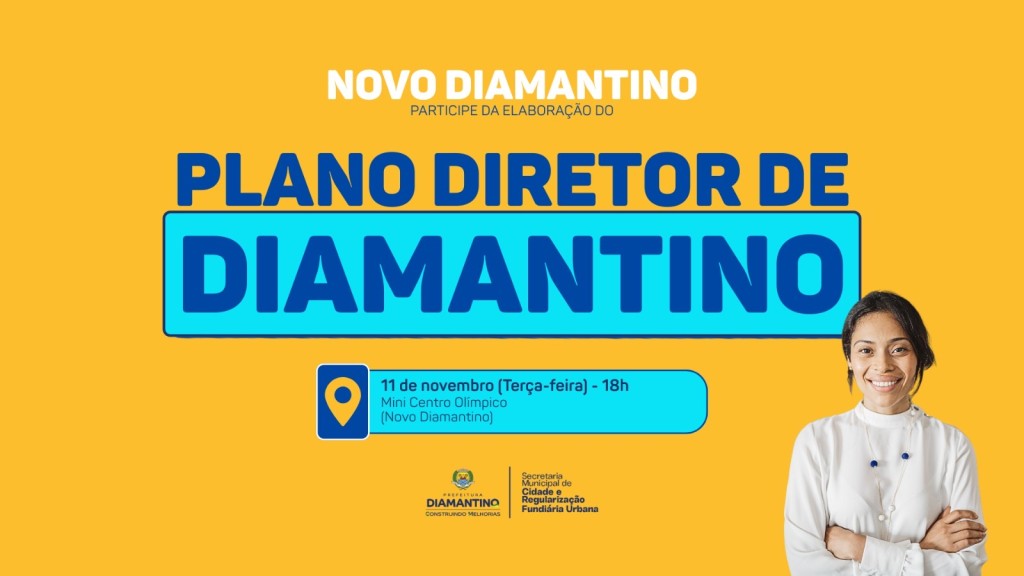 A Prefeitura de Diamantino, por meio da Secretaria Municipal de Cidades e Regularização Fundiária Urbana, em parceria com a Fundação Getúlio Vargas (FGV), convida toda a comunidade do bairro Novo Diamantino para participar da reunião de elaboração do Plano Diretor Municipal.