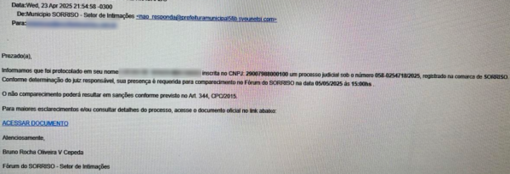 Um e-mail, enviado pela Prefeitura, e assinado pelo Setor de Intimações do Fórum. O documento informa a existência de um processo, com uma audiência já agendada. Em destaque, um link para acessar o documento.