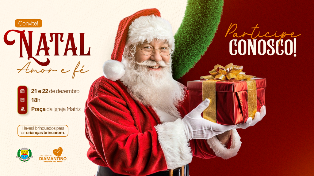 A Prefeitura de Diamantino realiza o Natal Amor e Fé nos dias 21 e 22 de dezembro, a partir das 18h, na Praça da Igreja Matriz. Todos estão convidados para momentos de devoção, fé, confraternização e lazer. Haverá parquinho com brinquedos para as crianças se divertirem, pipoca e algodão doce.