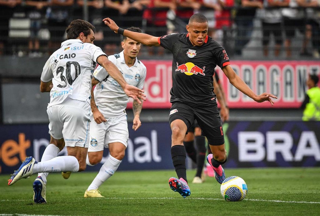 Apesar do início intenso dos mandantes, o Grêmio conseguiu equilibrar o jogo. A primeira grande chance foi do RB Bragantino, com Jhon Jhon recebendo livre na entrada da área, mas finalizando sem muita precisão. O Grêmio respondeu rapidamente com um chute de João Pedro que passou perto da trave.