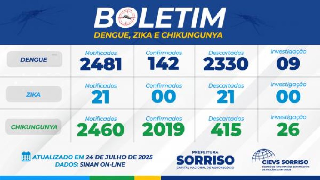 Hoje os bairros com maior número de registros de chikungunya estão o Vila Bela com 206; São José com 128; Nova Aliança com 123 registros e Novos Campos com 98 situações positivas. Antigo distrito de Boa Esperança e atual município vizinho de Boa Esperança contabilizou 294 registros – vale lembrar que no Ministério da Saúde, Boa Esperança ainda consta veiculado à Sorriso. Já em relação à dengue são oito casos no Centro e também oito no Jardim Amazônia.