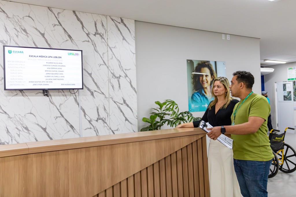 Na imagem, aparece a secretária de Saúde de Cuiabá, que veste uma saia longa branca e blusa preta. Ela está acompanhada de um servidor que usa calça jeans e camiseta verde. Ambos estão na recepção da unidade de saúde, observando o monitor que apresenta a escala de médicos do dia.