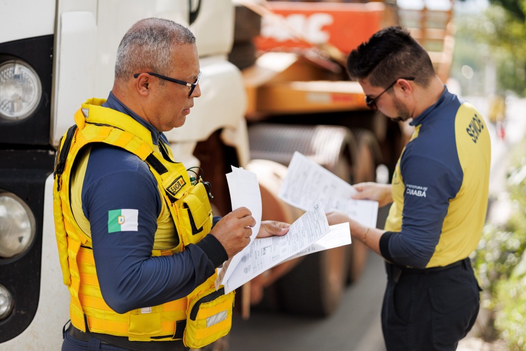 A foto mostra dois agentes da Semob verificando documentos. Eles estão em via pública, vestindo uniformes amarelo e azul.
