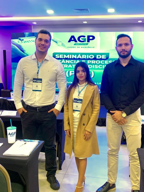 Os servidores Eline Cristina e Ruan Bonatti, assessores técnico-jurídicos da Secretaria Adjunta de Gestão de Pessoas de Rondonópolis, juntamente com o procurador municipal Márcio Henrique, estão participando de um importante seminário em Curitiba (PR). O evento, promovido pelo Instituto AGP, é voltado para a capacitação em sindicância e processo administrativo disciplinar.