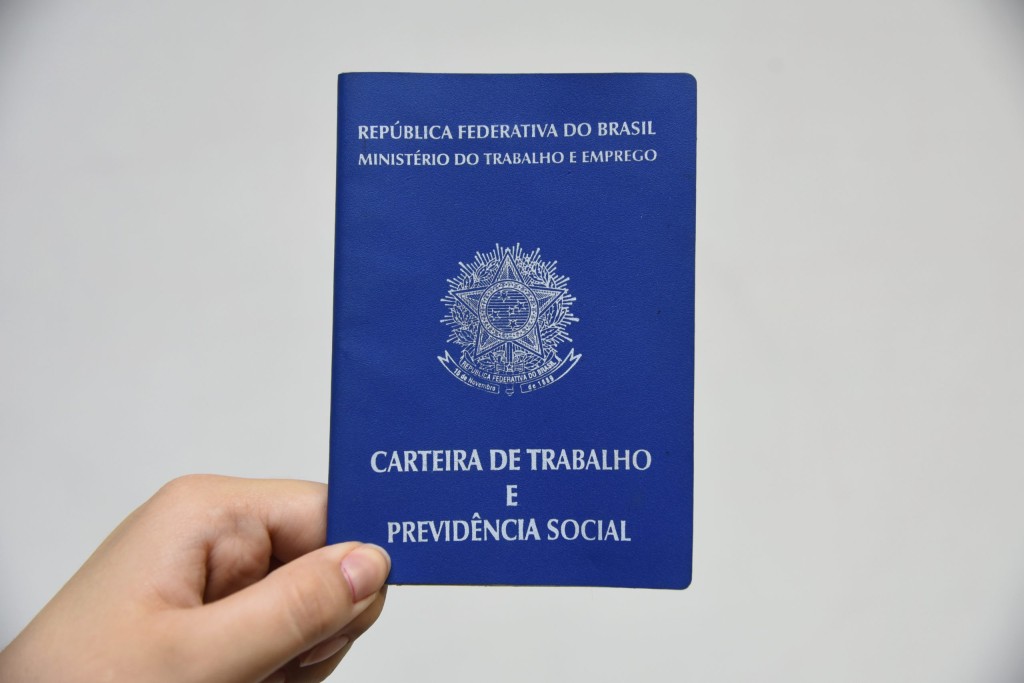 A imagem mostra uma carteira de trabalho na cor padrão azul royal e com o brazão da República Federativa do Brasil, sendo segurada por uma mão humana.