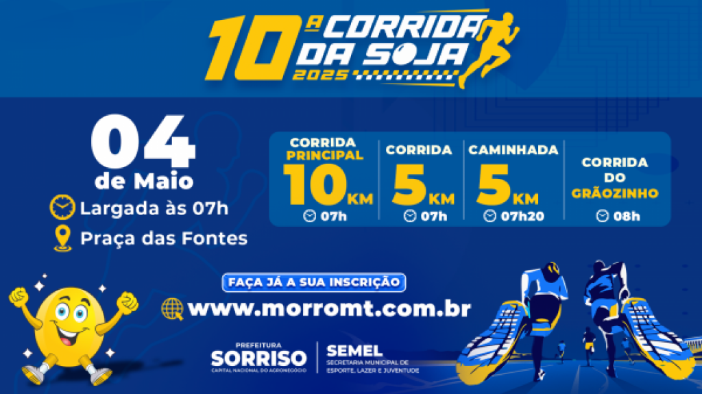 A Prefeitura de Sorriso realiza, no dia 4 de maio, a 10ª edição da Corrida da Soja. O evento, já consolidado no calendário esportivo do município, conta com apoio da Associação Sorrisense de Atletismo e da Federação Mato-grossense de Atletismo, e contará com as modalidades de 10 km e 5 km, além da caminhada de 5 km e a Corrida do Grãozinho.