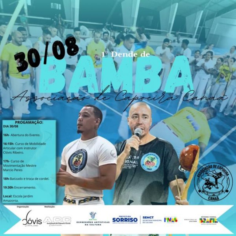 A capoeira, expressão cultural reconhecida como patrimônio imaterial da humanidade, será celebrada em Sorriso no próximo dia 30 de agosto, a partir das 15h, na Escola Jardim Amazônia, situada no bairro Jardim Amazônia. O local receberá o 1º Dendê de Bamba, evento de batizado e troca de graduação realizado pela Associação de Capoeira Canaã, organizado pelo instrutor Clóvis Canaã e supervisionado pelo mestre Márcio.