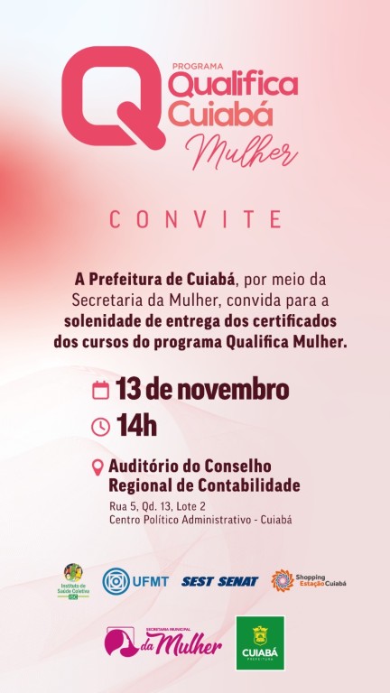 A Prefeitura de Cuiabá, via Secretaria Municipal da Mulher, certifica mais 117 mulheres, pelo Programa Qualifica Mulher de capacitação profissional. O evento ocorre nesta quarta-feira (13), às 14h, no auditório do Conselho Regional de Contabilidade, com a participação da primeira-dama Márcia Pinheiro, idealizadora do projeto que já certificou mais de 8 mil pessoas durante os oito anos da administração Emanuel Pinheiro.