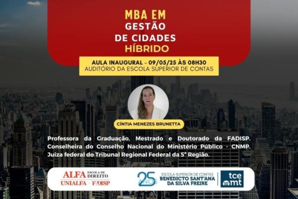 O Tribunal de Contas de Mato Grosso (TCE-MT) dá início, nesta sexta-feira (9), das 8h30 às 12h, ao MBA em Gestão de Cidades. A aula inaugural será realizada no auditório da Escola Superior de Contas e transmitida ao vivo pelo Canal do TCE-MT no YouTube e pela TV Contas (Canal 30.2).
