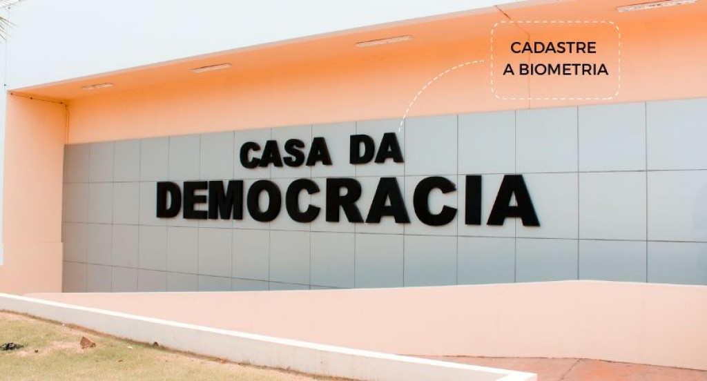 #PraTodosVerem: A imagem mostra a fachada de um prédio identificado como Casa da Democracia, com letras grandes e pretas em destaque na parede. No canto superior direito, há um balão de destaque com a mensagem “Cadastre a biometria”, incentivando os cidadãos e cidadãs a realizarem o procedimento.