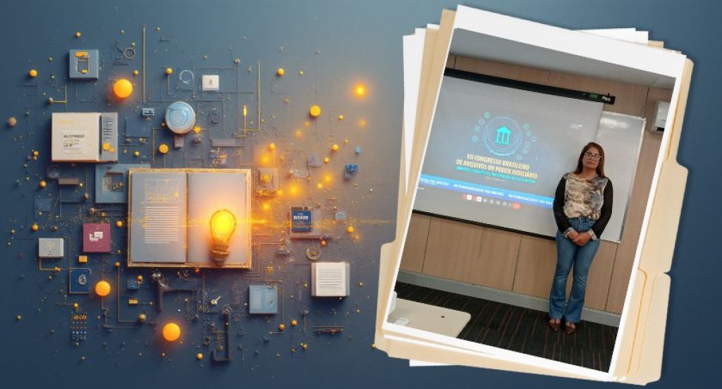 #PraTodosVerem: A imagem mostra uma composição visual com dois elementos principais: à esquerda, uma arte representando tecnologia e inovação, com livros, ícones digitais e uma lâmpada acesa simbolizando ideias e conhecimento; à direita, uma mulher posa para foto em frente a uma tela de projeção com o logotipo do VII Congresso Brasileiro de Arquivos do Poder Judiciário, sugerindo sua participação no evento.