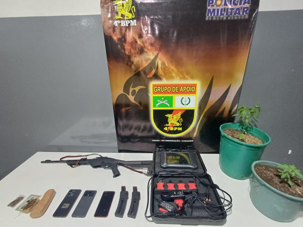 Os militares apreenderam uma espingarda calibre .22, dois carregadores, três tabletes de maconha e duas mudas do entorpecente.