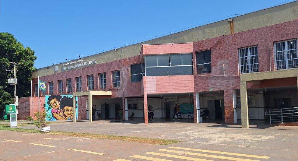 #PraTodosVerem – A imagem mostra a fachada de um prédio escolar de dois pavimentos, com paredes em tons de vermelho e bege. Na entrada principal, há colunas e uma cobertura simples, e na lateral destaca-se um mural colorido com rostos de pessoas sorrindo. Algumas pessoas circulam pelo local, e há sinalização de faixa de pedestres em frente ao edifício, sob um céu azul e ensolarado